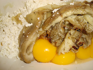 בינתיים נגרר לקערה 200 – 250 גר' גבינה בולגרית (אני מעדיף את זו של "גד" בשקית נייר – בולגרית 5% – לא זאת במליחות עדינה אלא הרגילה) נוסיף ארבע ביצים L (מספר 2). כשהחצילים מוכנים נוציא אותם מהסיר, נבצע חתך ניתוחי לאורך החציל, ועם האצבעות נסיר את הקליפה, כך שמתקבל חציל חצי מקולף – החלק שנוגע בקרש החיתוך עדיין עם קליפה. עם כף רגילה פשוט "נגרד" את בשר החציל מתוך הקליפה ונסיף לגבינה ולביצים.