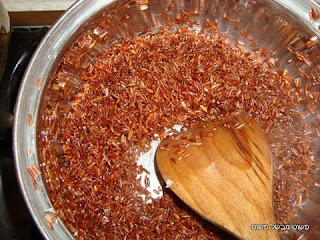 מוסיפים לאורז 2 ו- ¼ כוסות מים רותחים (הרבה יותר מאורז לבן – אורז אדום שותה המון מים) ומלח – המים של האורז צריכים להיות טעימים ומלוחים מספיק, ככה יודעים כמה. מנמיכים את האש למינימום ומכ