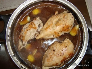 אחרי שסגרנו את הבשר ננמיך את האש ונוסיף נוזלים. לו הייתי שף פלצן הייתי שולח אתכם כרגע אל המקפיא שם ממתין לכם ציר עוף זך שהכנתם מעוף חופש אורגני שהתבשל במשך שתיים עשרה שעות. מאחר וסגרנו בתחילת היחסים שלנו על בישול פשוט – אני משתמש באבקת / משחת ציר של "קנור". בערך כוס מים רותחים וקצת פחות מכף משחת ציר בקר (אפשר להחליף באבקת מרק עוף או בקר) – כמובן שזה לא אמור לכסות את הבשר אלא להגיע בערך לקו השליש. נוסיף בערך שלוש כפות דבש ונערבב היטב. הרוטב וודאי כבר הגיע לרתיחה עדינה כעת. ננצל את הזמן ונקלף חצי לימון. אפשר להשתמש בקולפן ירקות או בסכין חד על מנת להשאיר רק את החלק הצהוב ולא את הלבן, המריר. נוסיף את קליפת הלימון לרוטב ונסחוט את הלימון (לא כולל גרעינים) פנימה גם כן. נטעם ונתקן טעמים (אפשר להוסיף דבש אם הרוטב חמצמץ מדי). מוסיפים שלוש שיני שום כתושות.