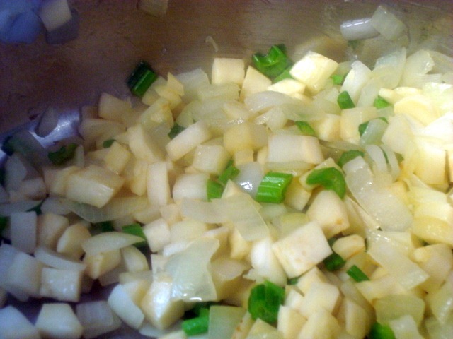 את החלק התחתון של גבעולי הסלרי שמחוברים לשורש נשטוף היטב (יש שם המון חול) ונפרוס לסהרונים קטנים בערך באותו עובי של קוביות הסלרי. נאדה תוך כדי ערבוב מדי פעם, עד שהריח של הסלרי המתקתק ממלא את המטבח ואת הנחיריים.