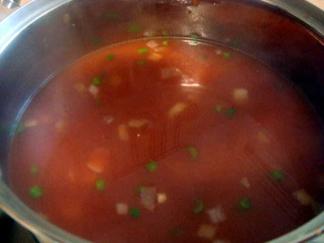 נוסיף את העגבניות לכבודה שמיטגנת לה בסיר וננמיך את האש – כמובן שנוסיף גם את העגבניות וגם את נוזלי העגבניות וגם את הכל. במיטב המסורת הפולנית של "לא זורקים כלום", נשפוך מעט מים רותחים לתוך קופסאות השימורים שמהן הגיעו העגבניות או הצלחת אליה ריסקנו את העגבניות וכך נרוויח לפחות עוד שלושה מ"ל של חומר גלם. סה"כ נוסיף בערך ליטר של מים רותחים או, אם יש לכם, ציר עוף או ירקות. אם אין לכם ציר עוף – אל תיפול רוחכם, לא יקרה כלום.