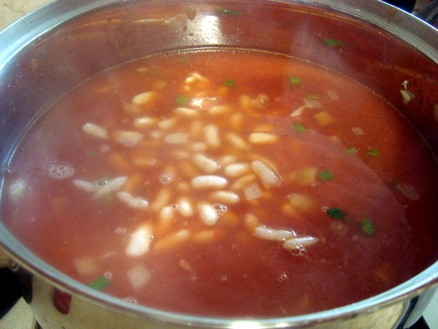 כמו ברוב המקומות שאני משתמש בהם בעגבניות טריות (או בעגבניות מרוסקות או שלמות מקופסאות שימורים באיכות טובה), אני אוהב להשלים את הטעם גם עם רסק עגבניות "רגיל" שנותן עוד מימד לטעם העגול והמלא של עגבניות. לאחר בישול ארוך, העגבניות מאבדות את כל התוקפנות והחמיצות שלהן ומסמיכות את המרק במין מישחתיות נעימה שכזו. כשמוסיפים את הטעם המתקתק והכמעט אגוזי של שעועית שהתבשלה שעות, זה הכי טוב שיש.
