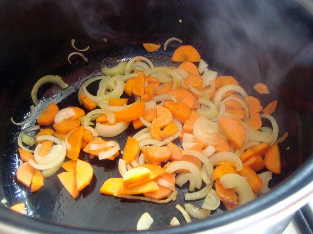 ניקח לנו שני גזרים יפים, נקלף אותם ונחצה אותם לאורכם. נפרוס לפרוסות בינוניות ("חצאי מטבעות"). נעשה אותו הדבר לשתי כרשות קטנות או כרישה אחת גדולה (אני מעדיף כרשות גדולות בצירים ומרקים – יש בהן הרבה יותר טעם). נחמם לנו מעט שמן זית בסיר (ממש מעט) עד שהוא מעלה מעט עשן, ונוסיף את הגזרים והגזר.