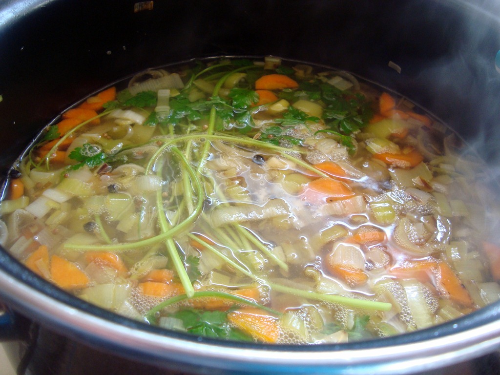 מטגנים את הגזר והכרישה במעט מאוד שמן זית. כשמתחיל להתרכך מוסיפים את הסלרי ומטגנים עוד כדקה. מוסיפים כליטר וחצי מים רותחים ואת היין, ומביאים לרתיחה. מוסיפים את עצמות הדגים ומביאים שוב לרתיחה. מנמיכים את האש ומבשלים כ- 45 דקות. מצננים מעט ומסננים דרך מסננת דקה.