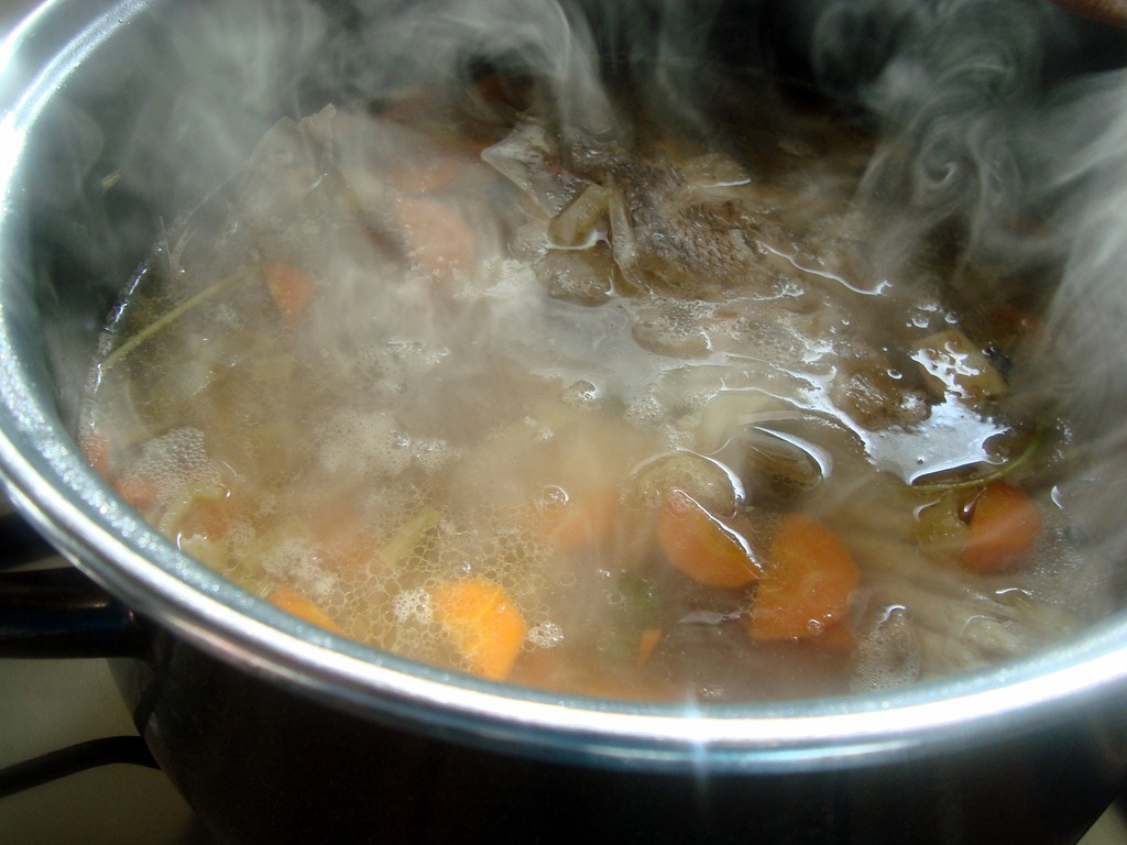נביא לרתיחה ונטעם (כרגע צריך רק לוודא שהמים מלוחים בצורה טעימה, לא הרבה מעבר לזה). נוסיף את עצמות הדגים, נביא לרתיחה נוספת וננמיח את האש לגמרי. נבשל כ- 45 דקות לא מכוסה, וזהו. בישול יתר של הציר יכול להוציא מהעצמות טעם מריר, אז לא להגזים.