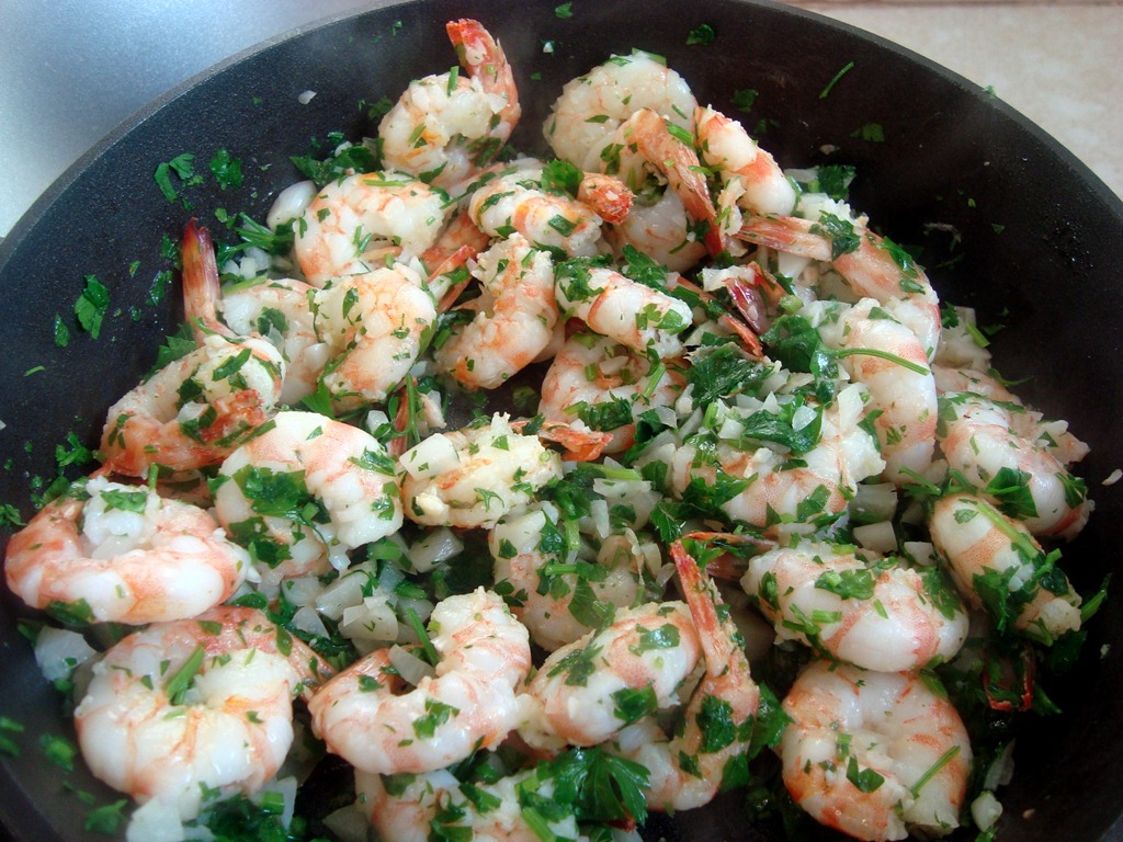 כשהשרימפסים מתחילים להפוך ללבן-וורדרד, נוסיף את הפטרוזיליה והשום ונערבב היטב.