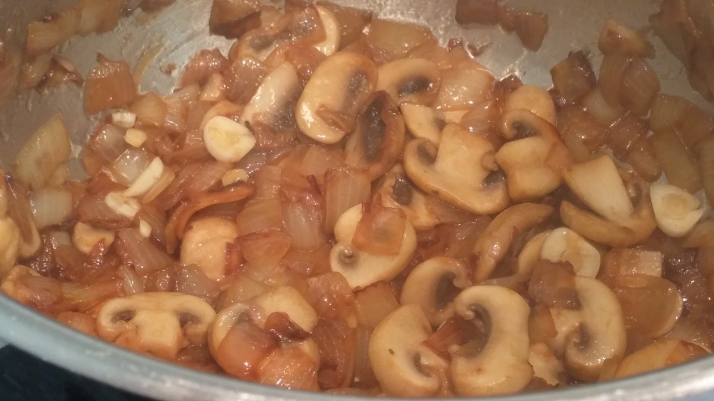 הבצל צריך להגיע לצבע שחמחם-זהוב כמו בתמונה. כשהוא מגיע לשם, הגבירו את הלהבה, והוסיפו את הפטריות. אנחנו רוצים להשחים / לצרוב את הפטריות מהר יחסית (בכדי שהבצל לא ייחרך), לכן נערבב מדי פעם ונשאיר על אש גבוהה. בינתיים נפרוס את שיני השום לפרוסות דקות יחסית.