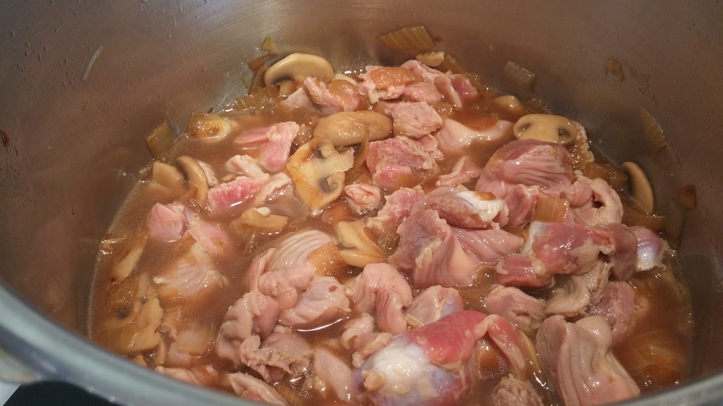 כשהקורקבנים נקיים, הבצל שחום, הפטריות גם הן מעט צרובות ובאוויר עולה ריח מדהים של שום, נוסיף את הקורקבנים לתערובת ונוסיף מים רותחים כמעט לכדי כיסוי. חשוב לא להוסיף יותר מדי מים, כל מה שאנחנו רוצים זה שיהיו מספיק נוזלים, אבל אנחנו גם רוצים שהג’לטין שייצא מהשריר לרוטב יהפוך אותו לסמיך וכיפי. אם יהיו יותר מדי נוזלים, זה לא ייקרה.