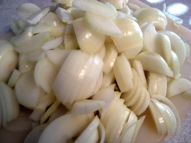 נתחיל, כמה צפוי, עם הבצל – נחצה ונפרוס ק"ג של בצלים (רגילים, לבנים או סגולים, או שילוב שלהם) לפרוסות דקות יחסית – לא צריך שהכל יהיה באותו עובי, אבל לא להשתולל יותר מדי עם ההבדלים. זה הזמן גם להרתיח קומקום שלם מלא במים.