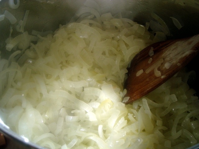 בסיר כבד, נמיס כ- 30 גר' חמאה ועוד כף של שמן זית – החמאה נשרפת בטמפרטורה נמוכה יחסית, ותוספת השמן מעלה את טמפרטורת השריפה של התערובת. נאדה את הבצלים עד שכולם הזיעו והתרככו.