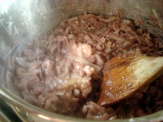 אחרי כ- 3 דקות של ערבוב, נוסיף כוס של יין לבצל. נהוג אמנם להוסיף למרק הזה יין לבן, אבל אני חייב להגיד שהנסיון שלי מראה שיין אדום עושה למרק הזה רק טוב, גם בצבע וכמובן שגם בטעם. אני רק מזכיר לכם שעם יין ב- 15 ש"ח לא מבשלים. מחטאים את השירותים – אולי, אבל לבישול אנחנו משתמשים ביין טעים, כזה שהיינו מוכנים לשתות בעצמנו.