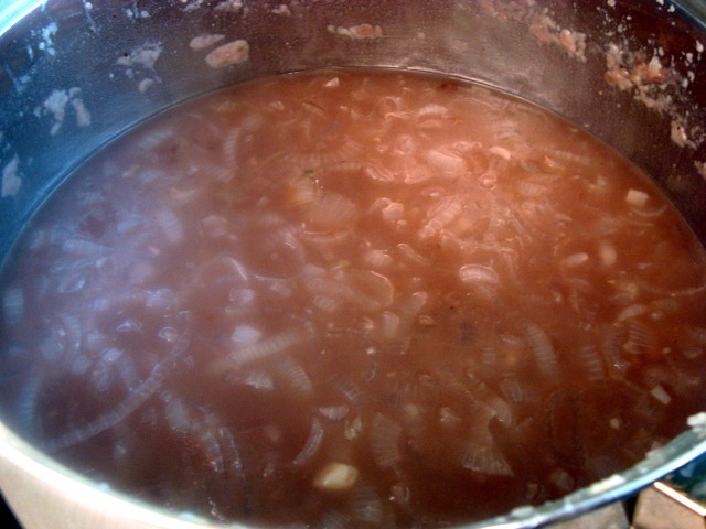 נמשיך לבשל את העניין הזה על אש גבוהה עד שכלל היין מתאדה ומצטמצם. כשזה קורה, נוסיף 8 כוסות של מים רותחים ונערבב היטב. טעימה קטנה, תוספת של מלח (גס) ופלפל שחור, ערבוב וטעימה נוספת – ואנחנו מוכנים לחלק הקשה ביותר – התמודדות עם הניחוחות של המרק הזה במשך שעתיים תוך כדי שהוא מתבשל על אש נמוכה.