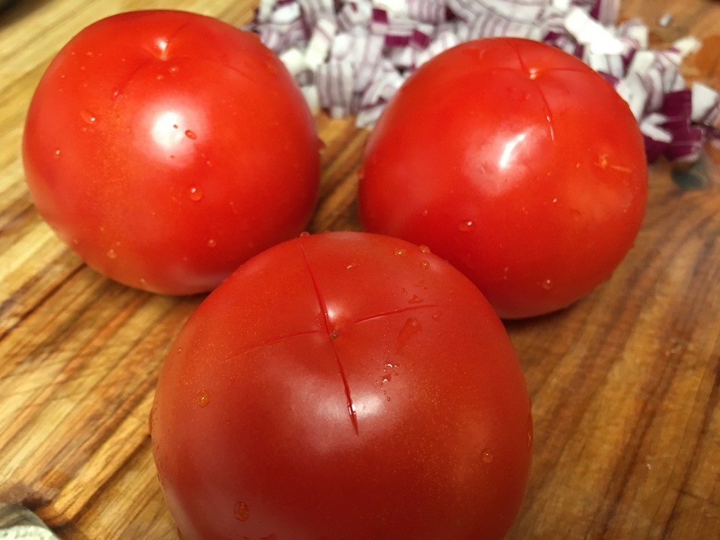 בגדול, סינייה היא קציצה אחת גדולה שמה ששומר עליה מלהתייבש זו השמיכה של הטחינה מלמעלה. אם כך, נתחיל בתערובת של קציצות. בעצם, שלב אחד לפני, מאחר ותערובת הקציצות הזו מקבלת זריקת טעם ועידון מעגבניות קצוצות שצריכות להתקלף להן, קודם כל נצייר עם סכין צלב בישבנן של שלוש עגבניות בינוניות, נכניס אותן לקערה ונכסה במים רותחים.