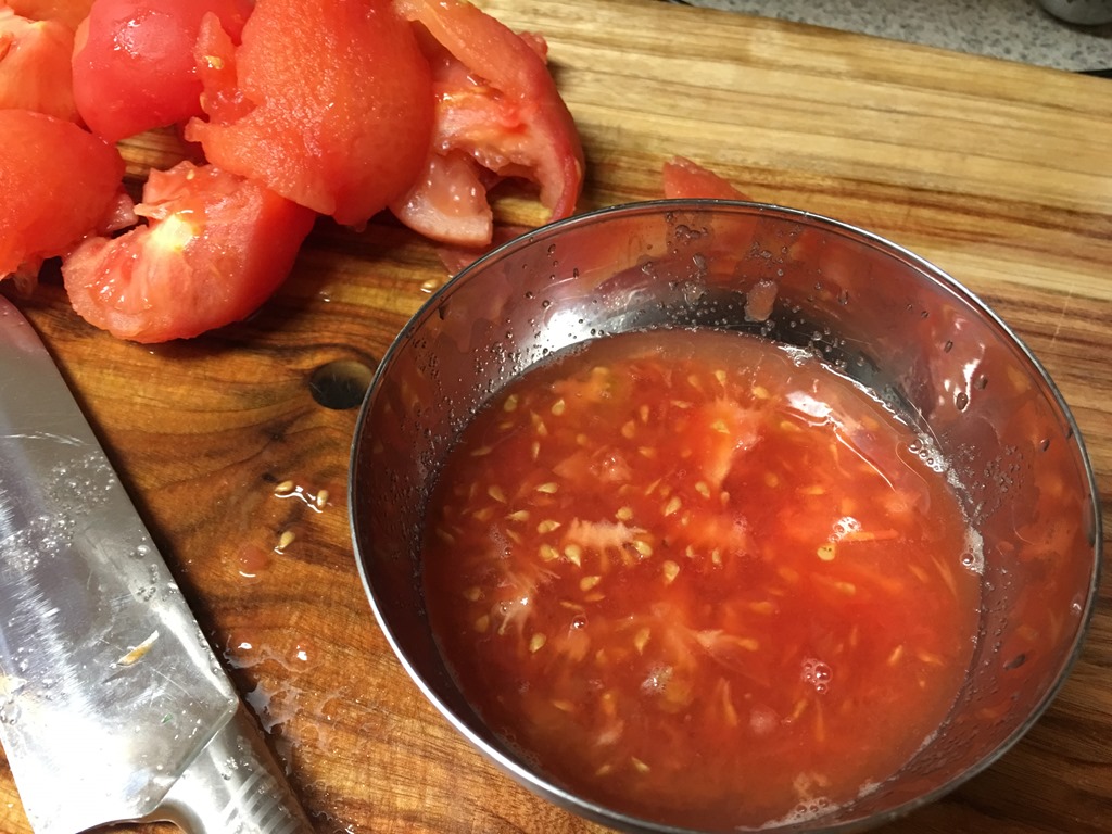העגבניות כבר הבינו בינתיים את הרמז, וכל מה שנצטרך בשביל לקלף אותן מהקליפה שלהן הוא משיכה קטנה וזהו. נחצה את העגבניות ובתנועה שמזכירה סחיטה של לימון, נסחוט את כל המיץ מהן לקערה. אם צריך להיעזר באצבעות בכדי לשחרר גרעינים שמפריעים למיץ לצאת – אל תתביישו.