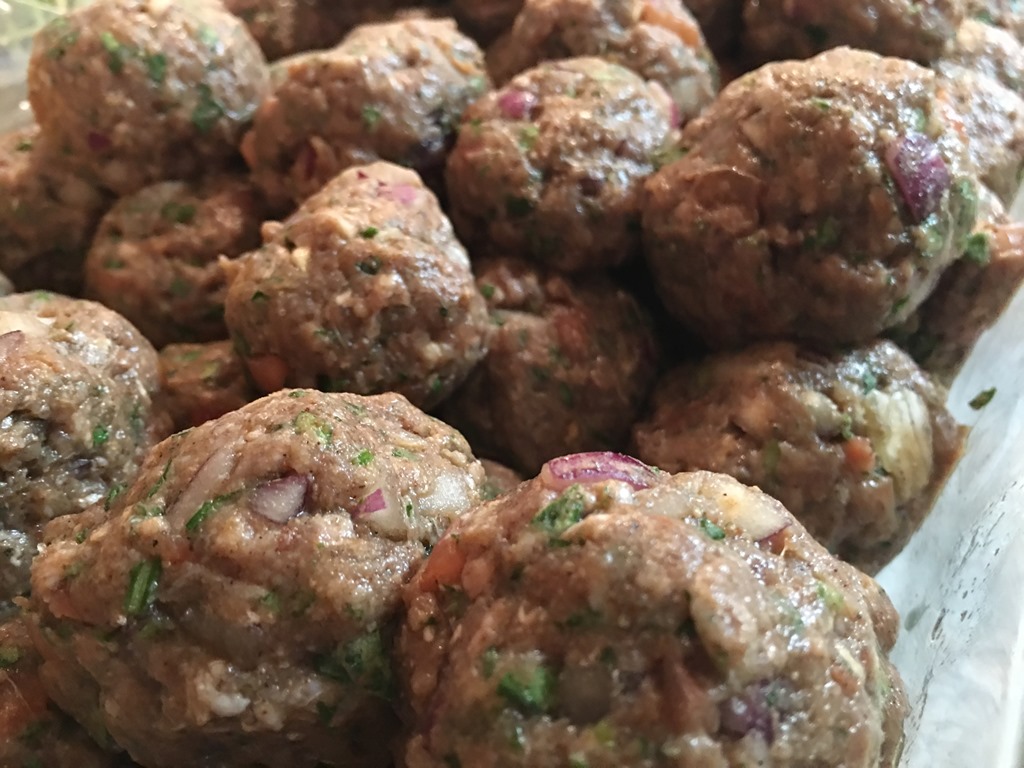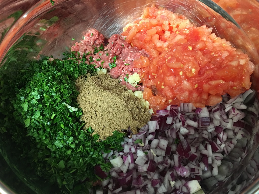 בינתיים, נניח בקערה גדולה בצל סגול גדול אחד שקצצנו לקוביות, ועוד ק”ג של בשר טחון, כדאי שיהיה שמן במקצת, אבל זו כבר בחירה אישית של טעם והעדפה.
