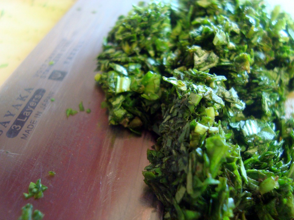 נקצוץ גם את השליש העליון של צרור כוסברה. דק-דק, כמובן. כף אחת מהכוסברה הקצוצה נפריש לקערה שכבר סחטנו אליה את מיץ העגבניות, ואת השאר – לתערובת.