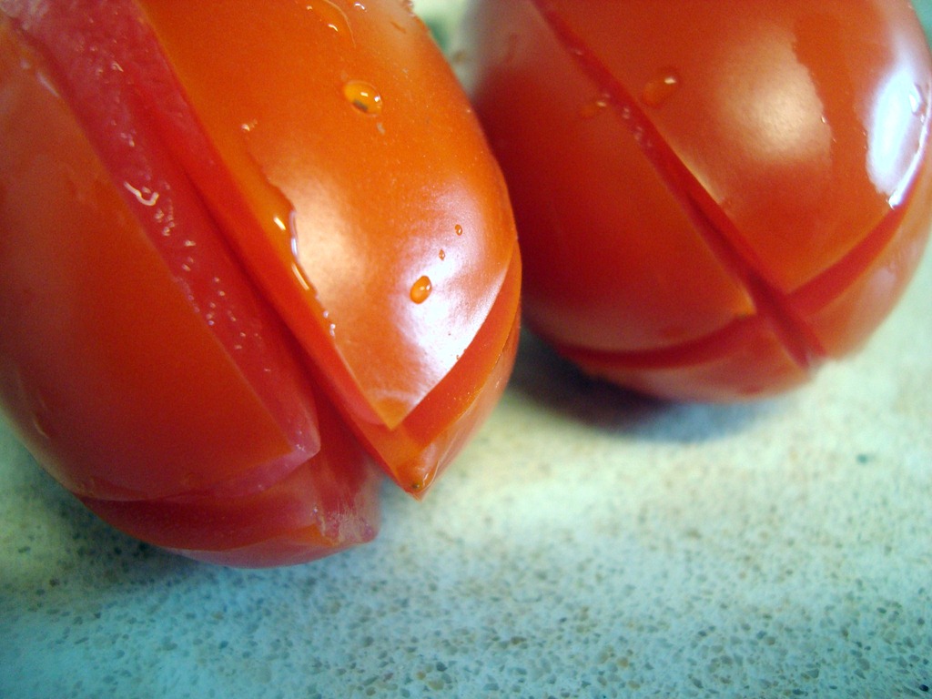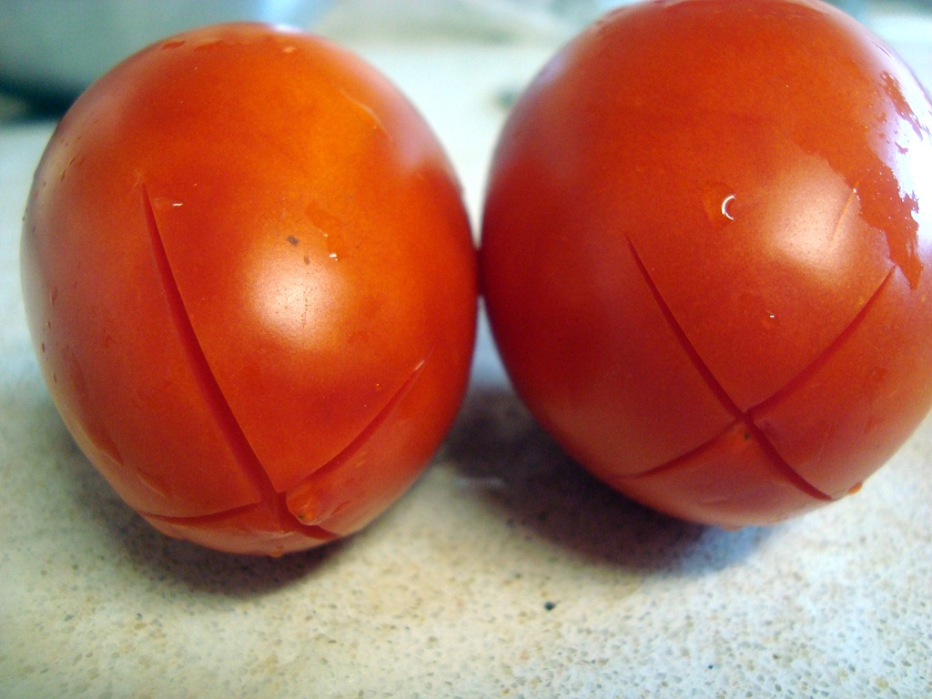 זה הזמן לבחור שתי עגבניות קטנות (או אחת גדולה) אדומות ויפות, ולחרוץ בהן צלב קטן בקצה המחודד שלהן (בצד השני מהגבעול).