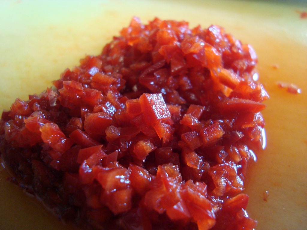 נקלף את העגבניות, נחצה אותן, ו-"נסחט אותן" מעל קערה קטנה. הרעיון הוא להיפטר מכמה שיותר נוזלים וגרעינים. את נוזלי העגבניה נשמור, כמו פולנים טובים שלא זורקים כלום – ונשתמש בהם לרוטב הטבילה. את העגבניות, כמה מפתיע, נקצוץ דק-דק. האמת שאני לא בטוח אם התמונה היא של העגבניות או של הפלפלים, אבל אני כמעט בטוח שזה של העגבניות.
