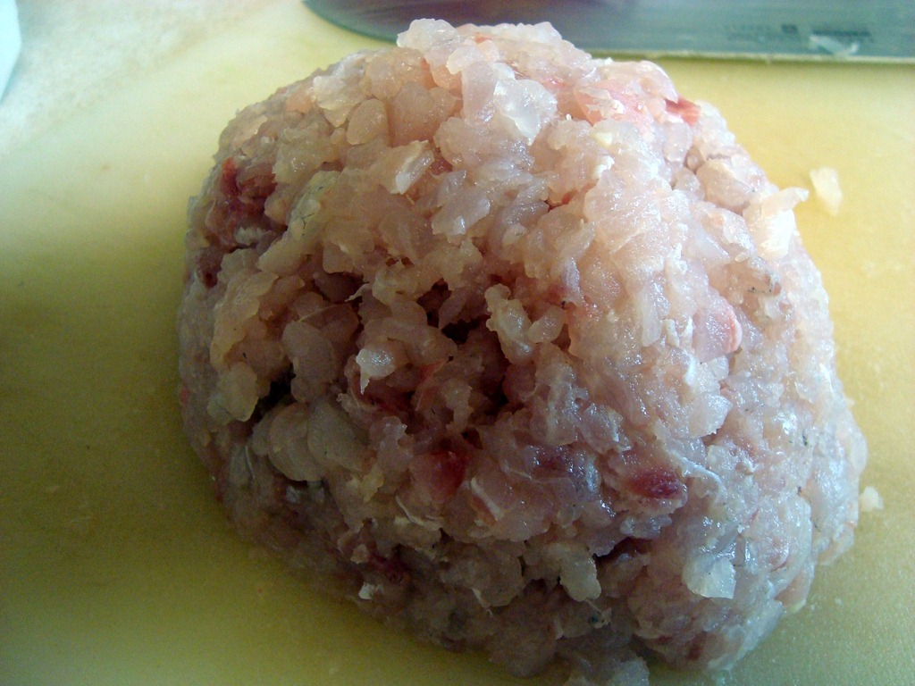 טכניקת הקיצוץ די דומה, למרות שבהתחלה אני מניח שייקח לכם קצת יותר זמן לחתוך לקוביות קטנות – החלק החיצוני של הדג מכיל לפעמים מעין רצועות של רקמה שהיא טיפה יותר קשה לחיתוך, תשקיעו קצת יותר בחיתוך לקוביות בינוניות ורק אז תתחילו בקיצוץ הרגיל. אני ממליץ כאן לא לנסות ולקצוץ את כל הדג במכה אחת אלא לעבוד ב-"נאגלות", לפחות 5-6 נאגלות של קיצוץ, כל פעם קצת. בסוף, כשהכל קצוץ, לערבב את הכל ולקצוץ עוד קצת כשהכל מערובב. בסוף תקבלו כמות יפה של דג קצוץ דק, אבל לא דק מדי.