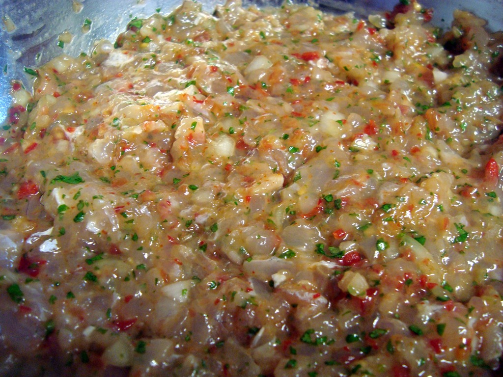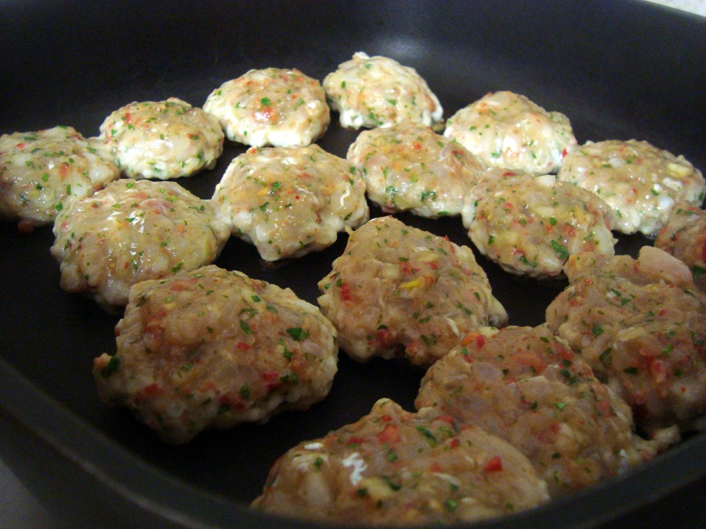 נערבב עם תערובת הירקות והתבלינים הקצוצים. אפשר לטעום – זה מין סוג של סביצ'ה, לא? – ונתקן טעמים (אם חסר מלח, תוסיפו בעדינות עוד כמה טיפות של רוטב דגים אבל לא יותר מדי בכדי שהתערובת לא תהיה דלילה יותר, ואם צריך תוסיפו מלח רגיל). נוסיף שתי כפיות של קורנפלור וחלבון אחד. הקורנפלור והחלבון יעזרו לתערובת להתגבש ו-"להחזיק". נערבב היטב, נכסה בניילון נצמד ונאשפז לפחות לשעה במקרר, בכדי שהתערובת תנוח. אם התערובת לא תנוח מספיק, הקבבים יתפרקו בזמן ההכנה, וחבל.