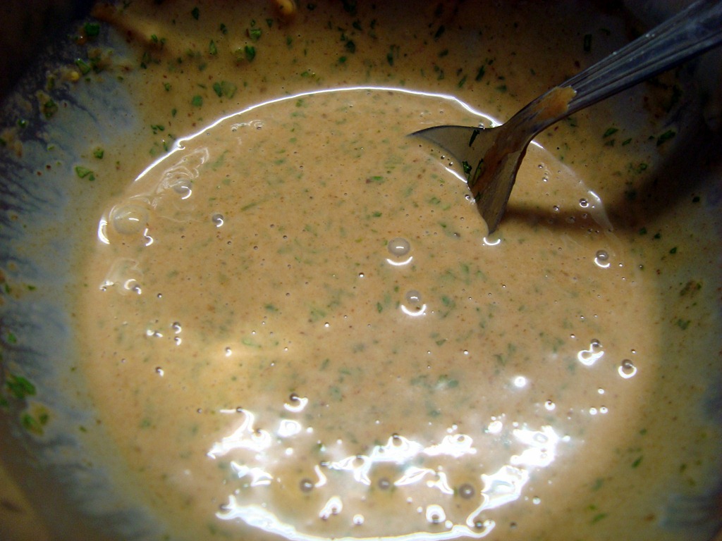 בזמן שהקבבים שלנו מיטגנים להם נכין רוטב טבילה. זוכרים את הקערה הקטנה עם מיץ העגבניות והכוסברה? אני הוספתי אליה שתי כפות של טחינת שקדים (אפשר להשיג היום כמעט בכל סופר, ואם לא – אז בחנות טבע, אבל גם אם לא השגתם, תשתמשו בטחינה גולמית רגילה, לא יקרה כלום), כף של מיץ לימון, שתי כפות של רוטב צ'ילי מתוק, כף רוטב דגים ושתי כפות מים. מערבבים את הכל היטב בעזרת מזלג עד לטקסטורה של טחינה דלילה מעט.