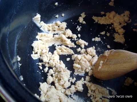 בסיר כבד נניח שתי כפות שמן זית ונניח את הסיר על אש בינונית. כשהשמן חם ומתחיל לעשן טיפה, נוסיף לשמן שתי כפות גדושות מאוד של קמח. ונערבב היטב, בהתחלה בעזרת כף עץ. תתקבל תערובת במרקם מעט גושי ויבש.