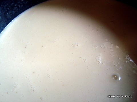 מוסיפים ליטר חלב ומערבבים היטב. מחזירים לאש וממשיכים לערבב בעזרת מטרפה עד שמתקבלת רביכה אחידה. מתבלים באב' מרק עוף, מלח ופלפל.
